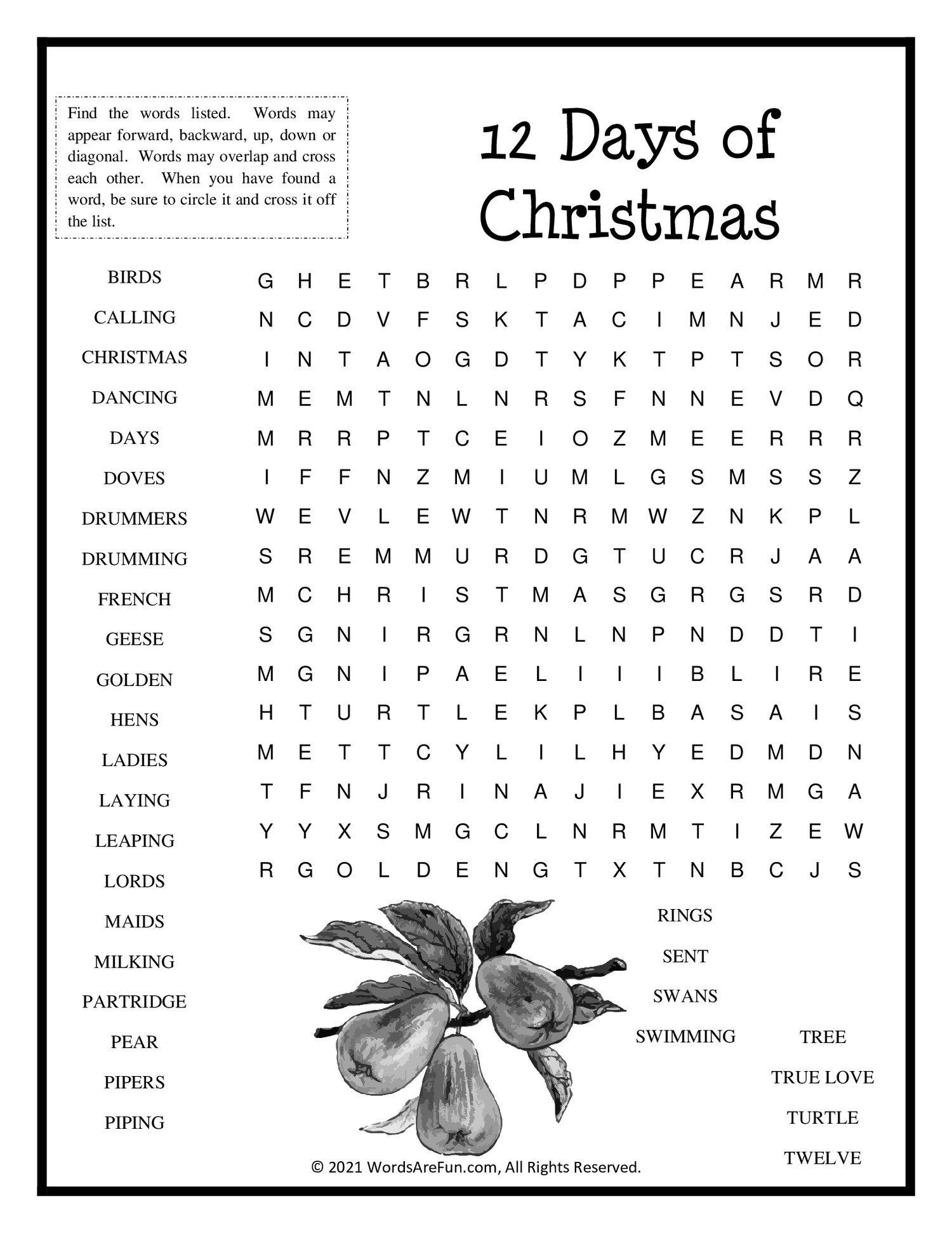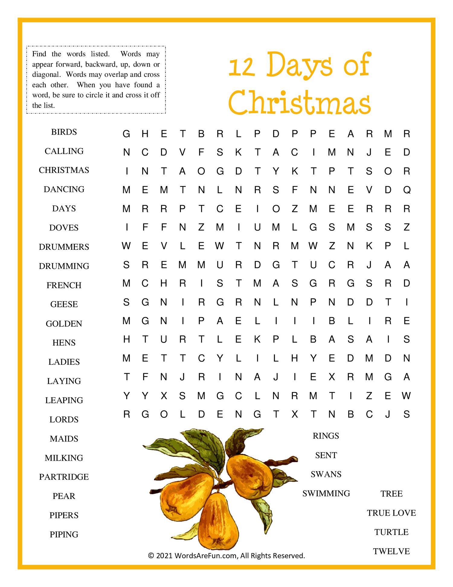 Word List: Birds, Calling, Christmas, Dancing, Days, Doves, Drummers, Drumming, French, Geese, Golden, Hens, Ladies, Laying, Leaping, Lords, Maids, Milking, Partridge, Pear, Pipers, Piping, Rings, Sent, Swans, Swimming, Tree, True Love, Turtle, Twelve.