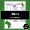 Africa word search, African animals, African countries puzzle, geography printable, kids word search, homeschool activity, classroom worksheet, African wildlife game, cultural geography activity, map & continent word search, educational puzzle, early finisher activity, Africa travel puzzle, Savanna word search, African landmark activity
