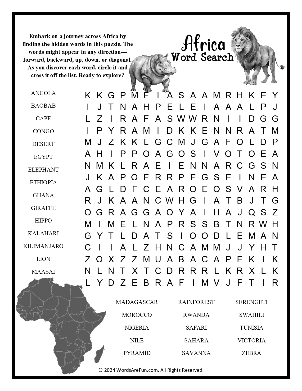 Word List: Angola, Baobab, Cape, Congo, Desert, Egypt, Elephant, Ethiopia, Ghana, Giraffe, Hippo, Kalahari, Kilimanjaro, Lion, Maasai, Madagascar, Morocco, Nigeria, Nile, Pyramid, Rainforest, Rwanda, Safari, Sahara, Savanna, Serengeti, Swahili, Tunisia, Victoria, Zebra.