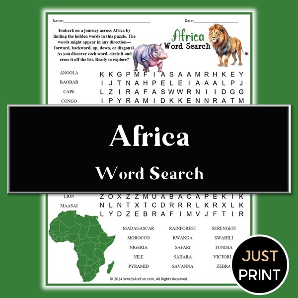 Africa Word Search | Printable Puzzle with Wildlife, Countries & Landmarks