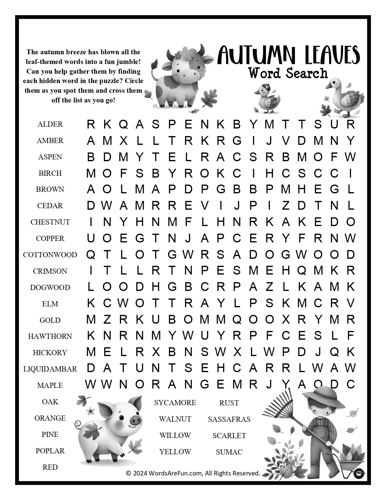 Word List: Alder, Amber, Aspen, Birch, Brown, Cedar, Chestnut, Copper, Cottonwood, Crimson, Dogwood, Elm, Gold, Hawthorn, Hickory, Liquidambar, Maple, Oak, Orange, Pine, Poplar, Red, Rust, Sassafras, Scarlet, Sumac, Sycamore, Walnut, Willow, Yellow.