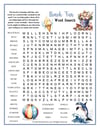 Word List Includes: Beach Ball, Boat, Breeze, Bucket, Coral, Crab, Dolphin, Flip-Flops, Kite, Lifeguard, Ocean, Picnic, Sand, Sandcastle, Seagull, Shells, Shore, Shovel, Snorkel, Starfish, Sunglasses, Sun Hat, Sunscreen, Surfboard, Swimsuit, Tides, Towels, Umbrella, Water, Waves.