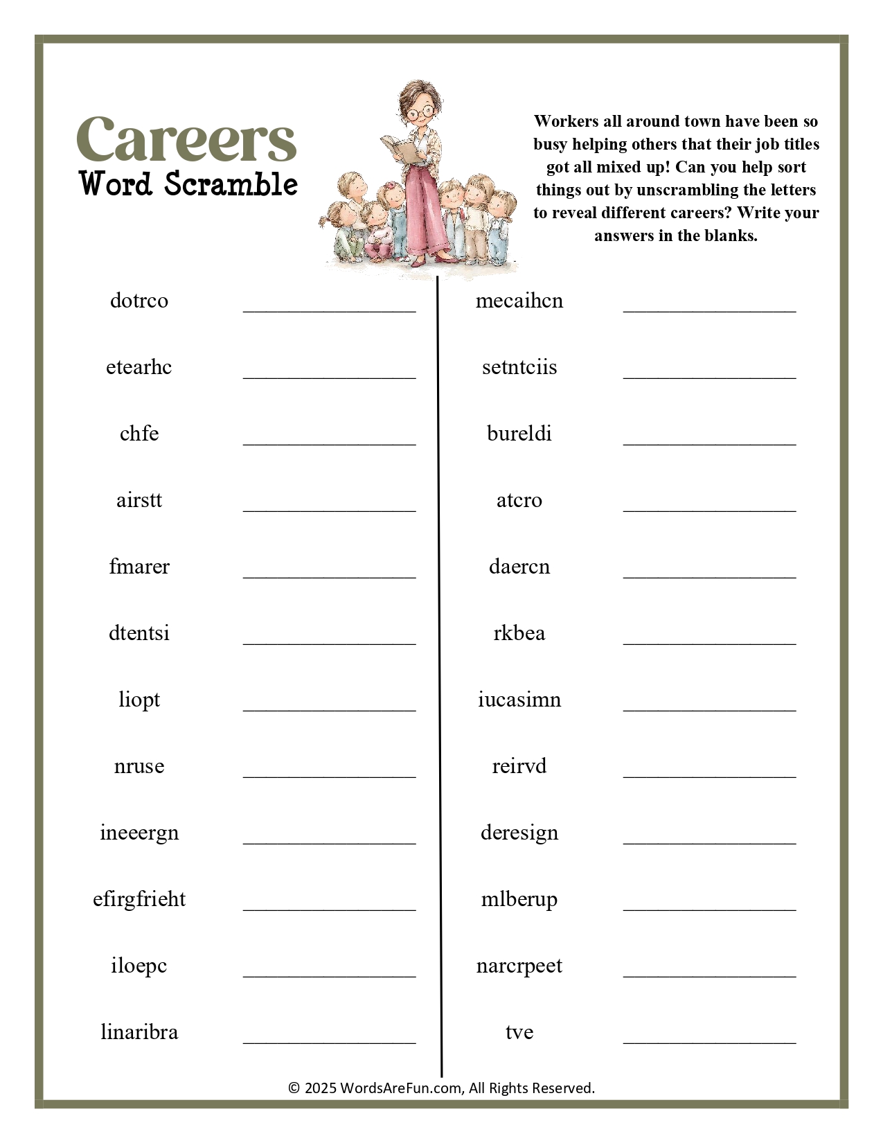 Thank you for supporting my small business and choosing this printable Careers Word Scramble for your classroom!
