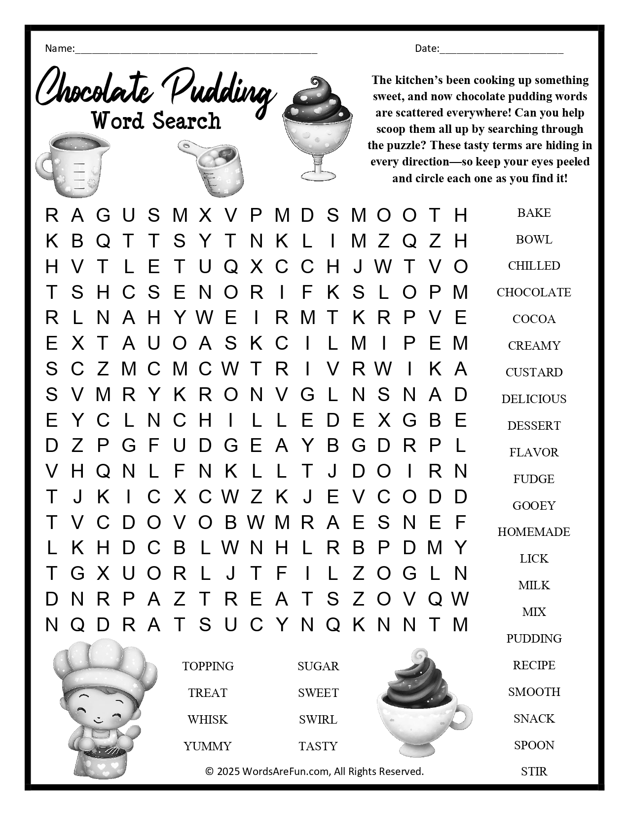 Chocolate Pudding Day Word Search Printable – Fun Dessert Activity for Kids & Classrooms
