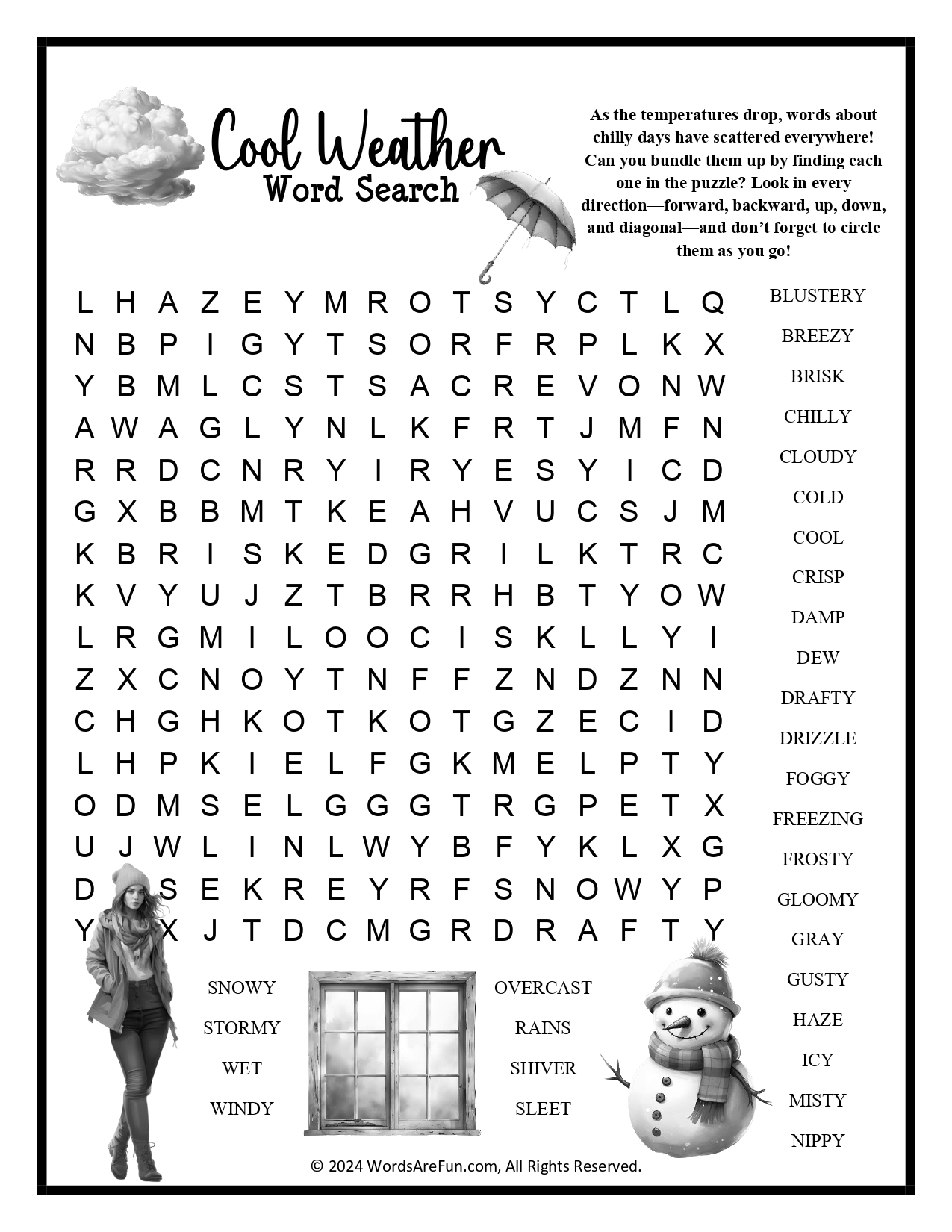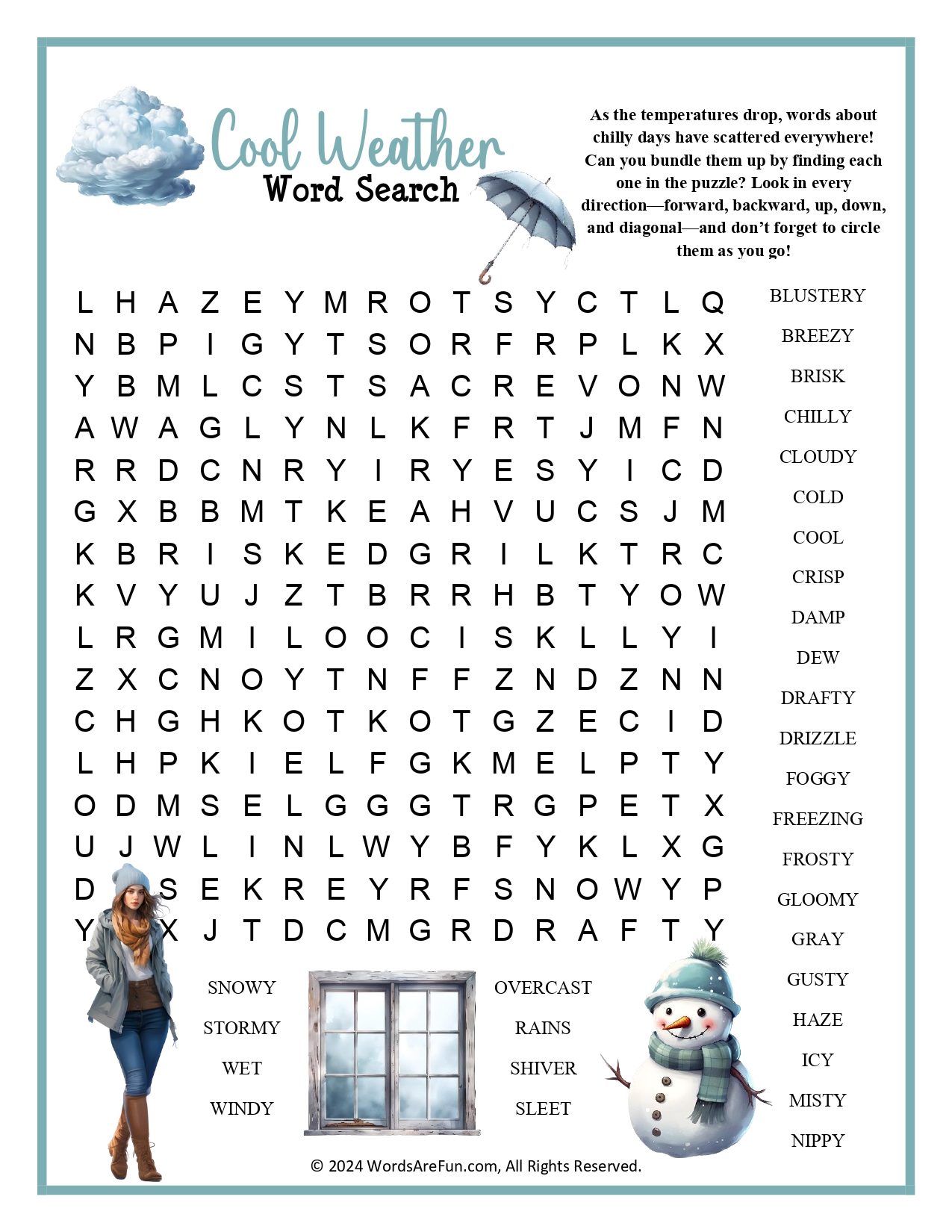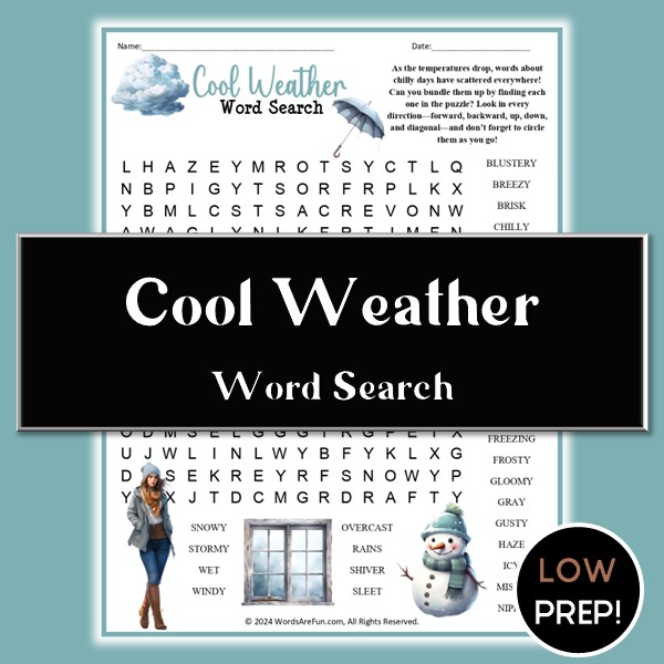 Word List: Blustery, Breezy, Brisk, Chilly, Cloudy, Cold, Cool, Crisp, Damp, Dew, Drafty, Drizzle, Foggy, Freezing, Frosty, Gloomy, Gray, Gusty, Haze, Icy, Misty, Nippy, Overcast, Rains, Shiver, Sleet, Snowy, Stormy, Wet, Windy.