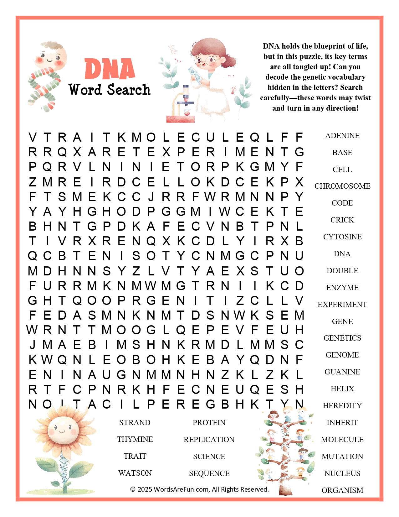 Word List: Adenine, Base, Cell, Chromosome, Code, Crick, Cytosine, DNA, Double, Enzyme, Experiment, Gene, Genetics, Genome, Guanine, Helix, Heredity, Inherit, Molecule, Mutation, Nucleus, Organism, Protein, Replication, Science, Sequence, Strand, Thymine, Trait, Watson.
