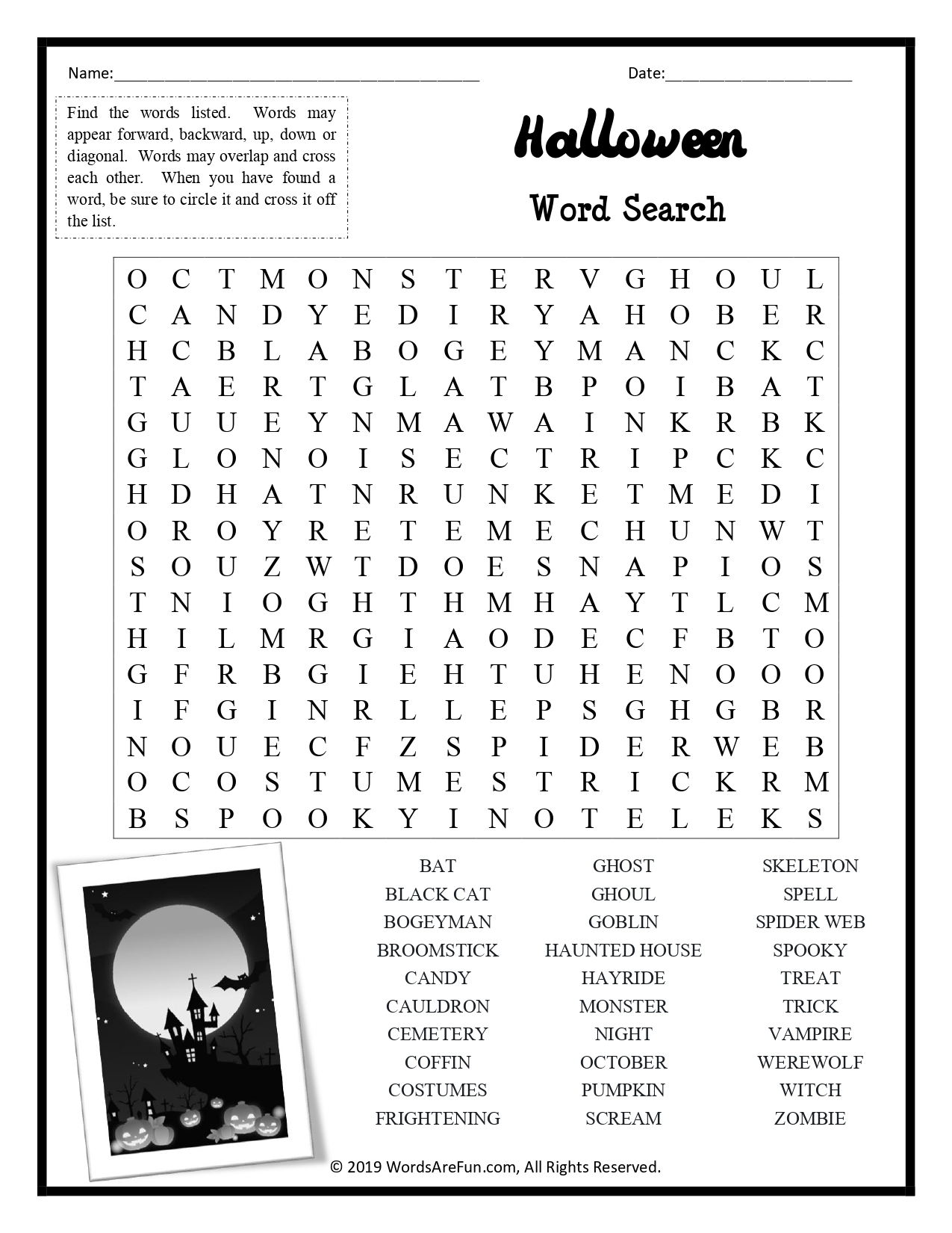 - Word search puzzles (color & B/W, with and without name/date lines)