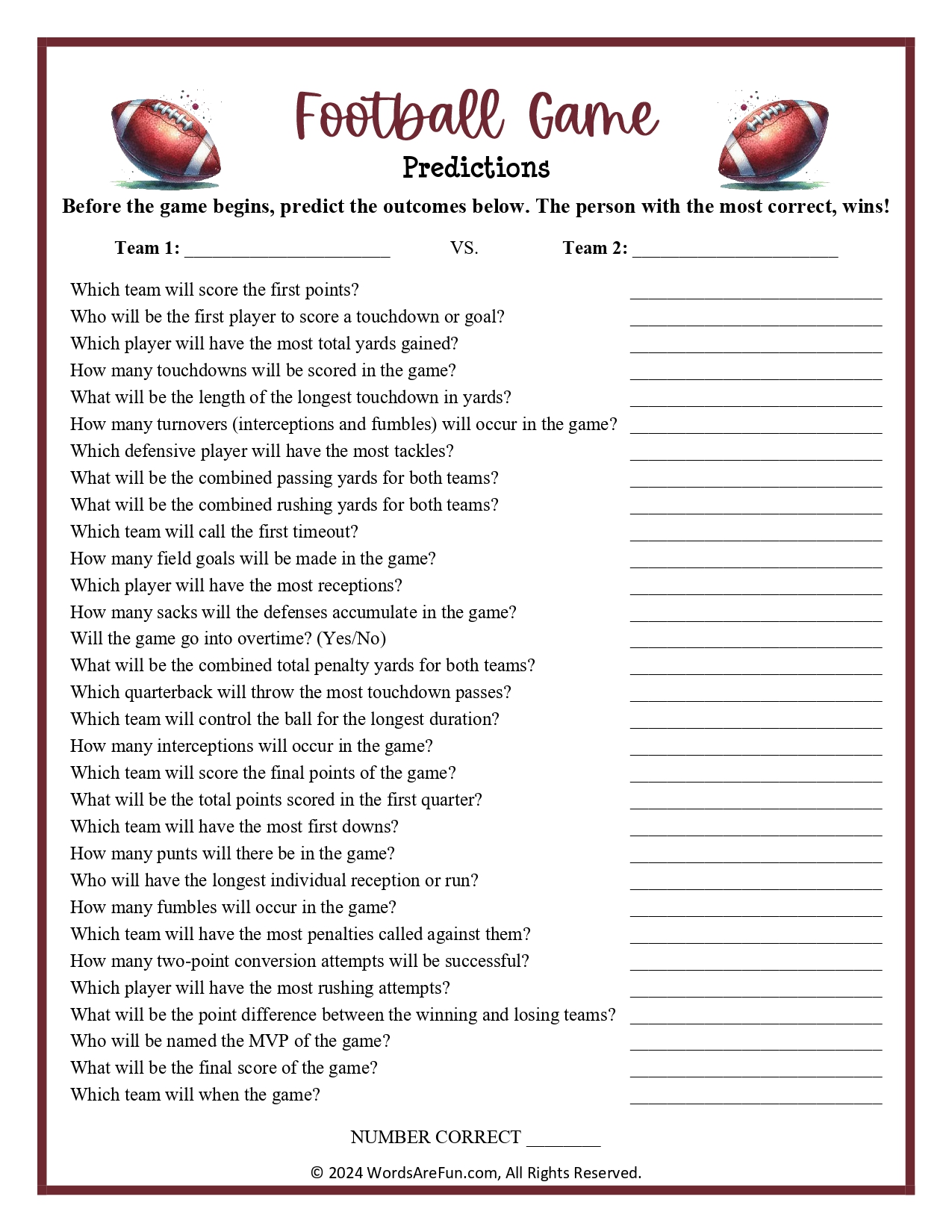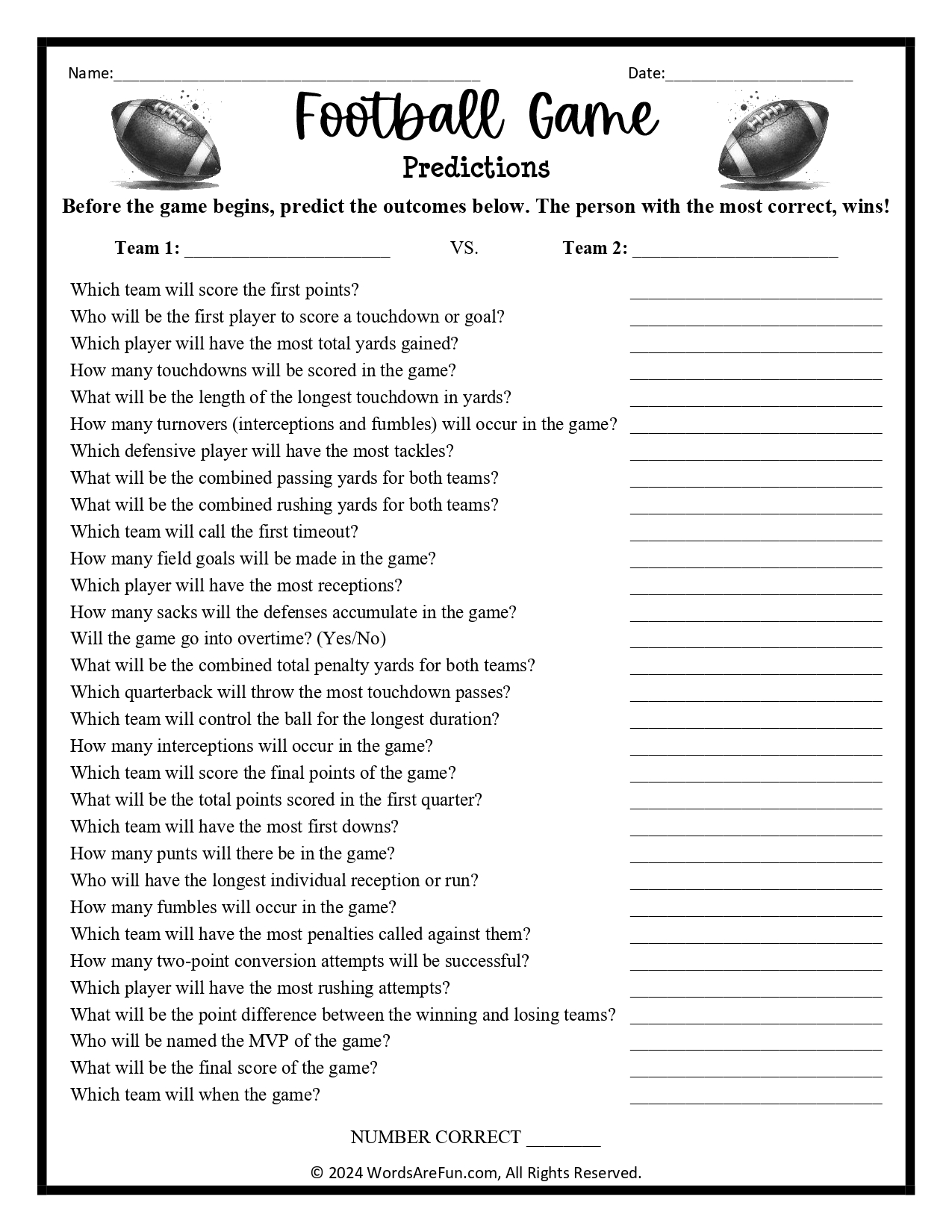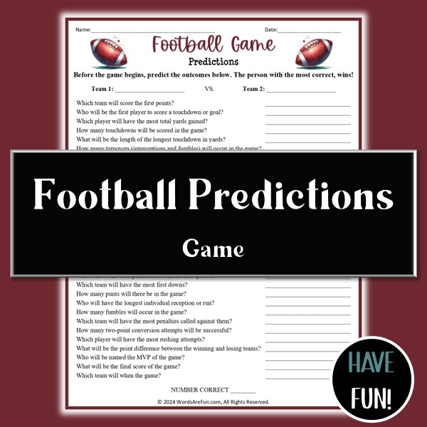 football predictions game, football printable game, football party game, football activity for kids, sports prediction game, football classroom activity, printable football game, football game day activity, sports themed party game, football worksheet printable, homeschool sports activity, group game printable, football fun activity, printable party game, sports themed activity