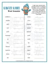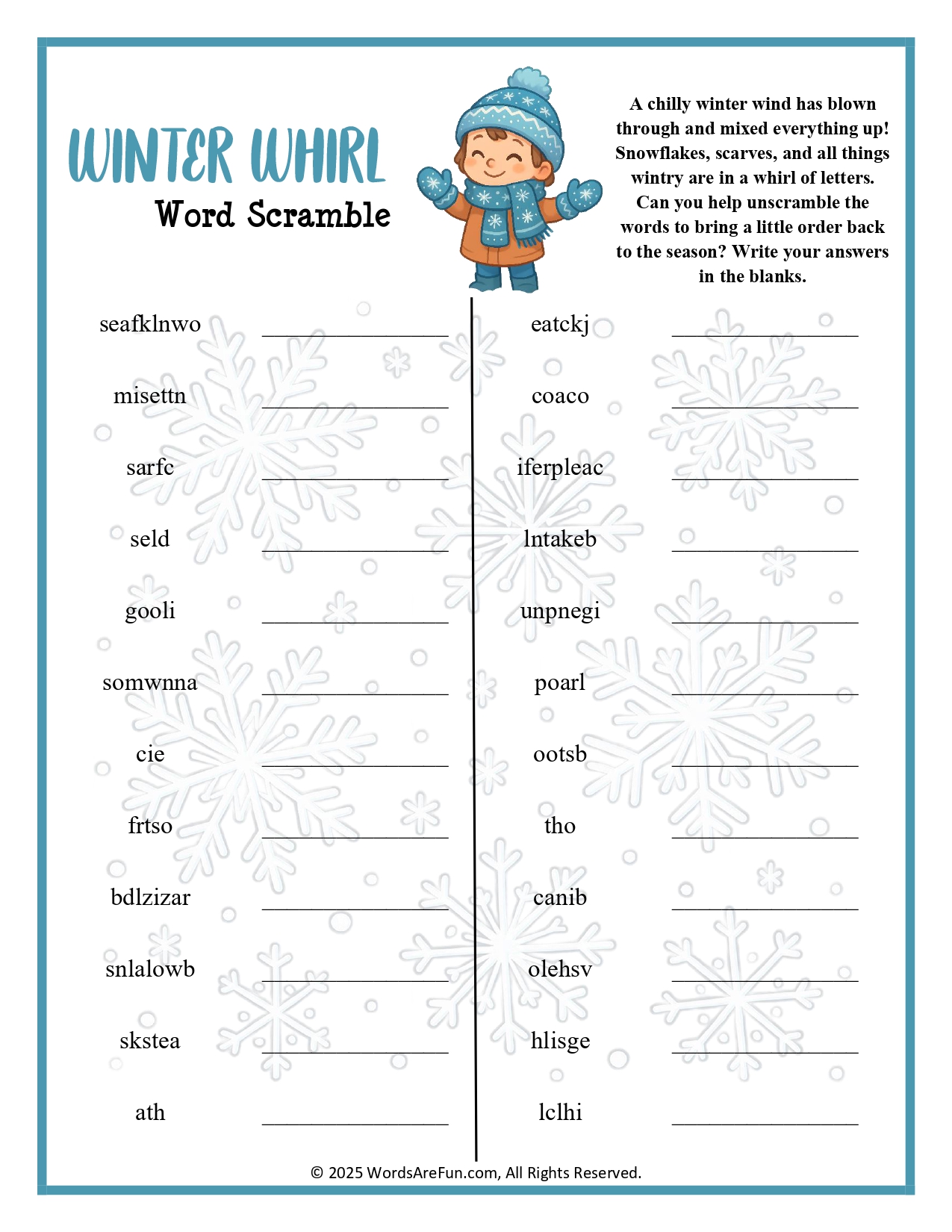 Winter Whirl Word Scramble Word Bank: Blanket, Blizzard, Boots, Cabin, Chill, Cocoa, Fireplace, Frost, Hat, Hot, Ice, Igloo, Jacket, Mittens, Penguin, Polar, Scarf, Shovel, Skates, Sled, Sleigh, Snowball, Snowflake, Snowman.