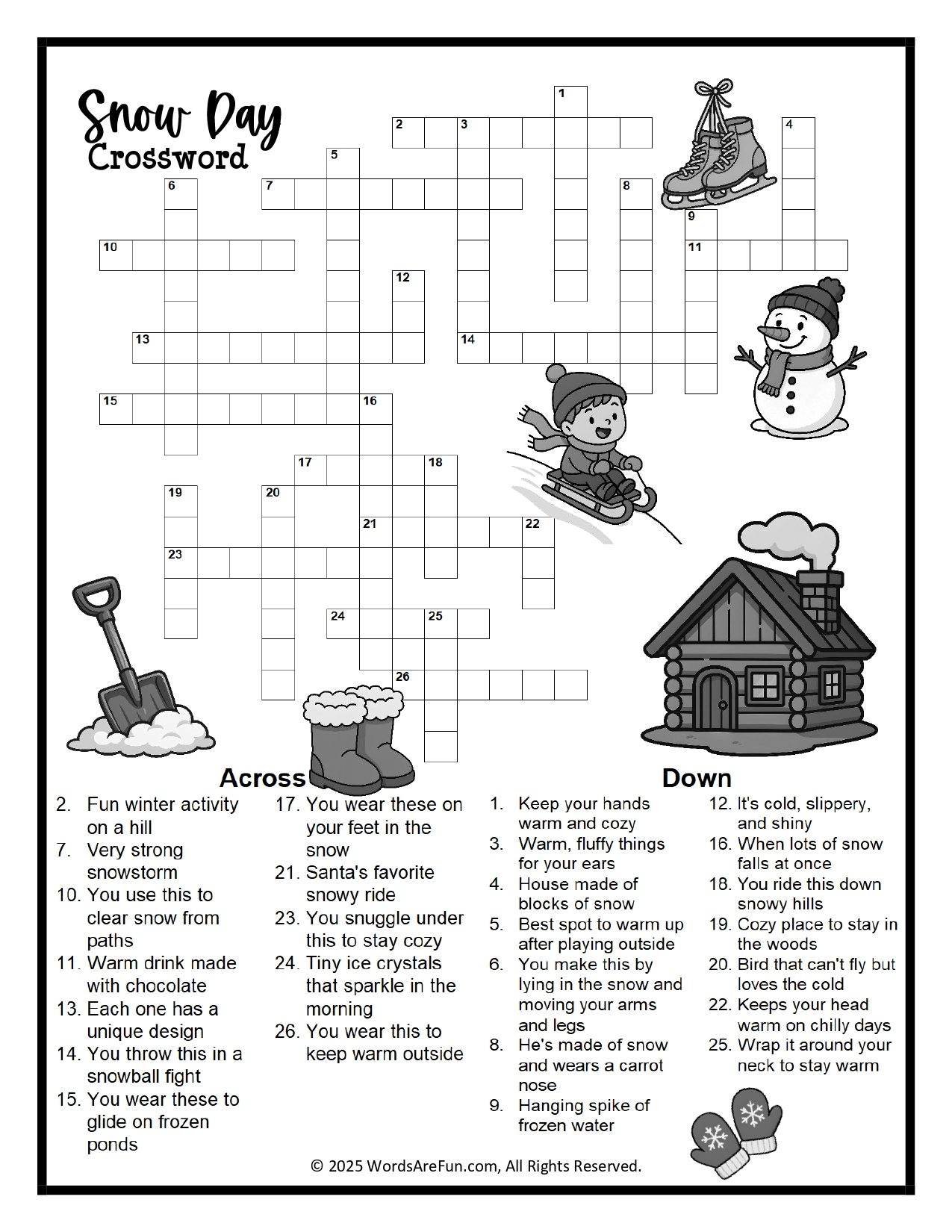 Snow Day Crossword Puzzle Word Bank: Blanket, Blizzard, Boots, Cabin, Cocoa, Earmuffs, Fireplace, Frost, Hat, Ice, Ice Skates, Icicle, Igloo, Jacket, Mittens, Penguin, Scarf, Shovel, Sled, Sledding, Sleigh, Snow Angel, Snowball, Snowflake, Snowman, Snowstorm