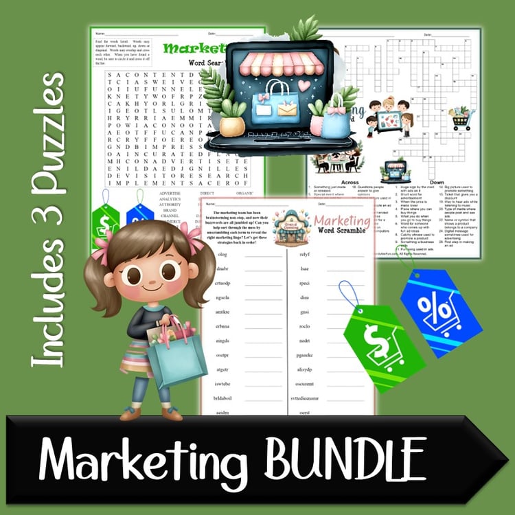 Each activity includes both color and black-and-white versions with name and date lines. Word-based puzzles also include word banks and solutions for easy learning.