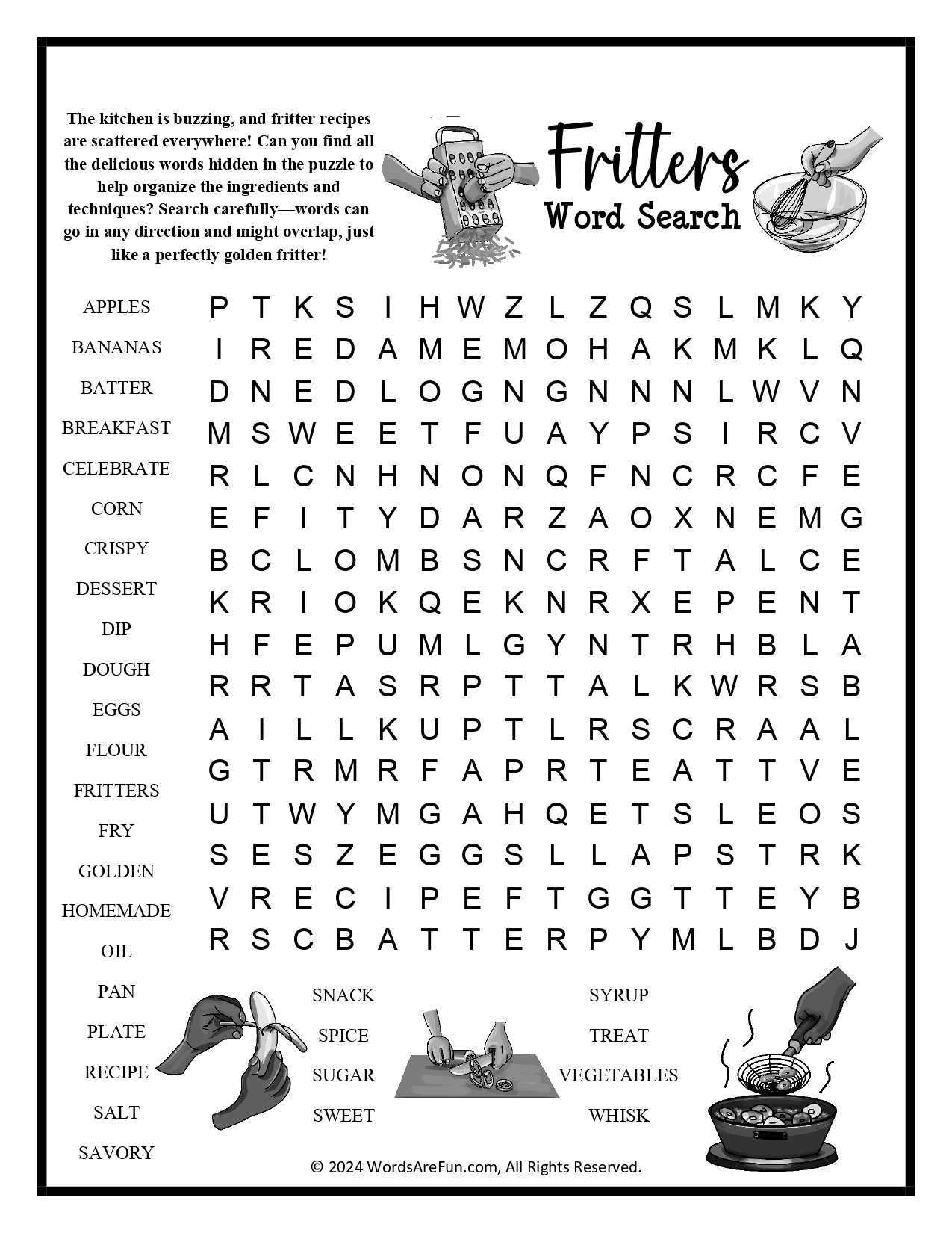 Word List: Apples, Bananas, Batter, Breakfast, Celebrate, Corn, Crispy, Dessert, Dip, Dough, Eggs, Flour, Fritters, Fry, Golden, Homemade, Oil, Pan, Plate, Recipe, Salt, Savory, Snack, Spice, Sugar, Sweet, Syrup, Treat, Vegetables, Whisk.