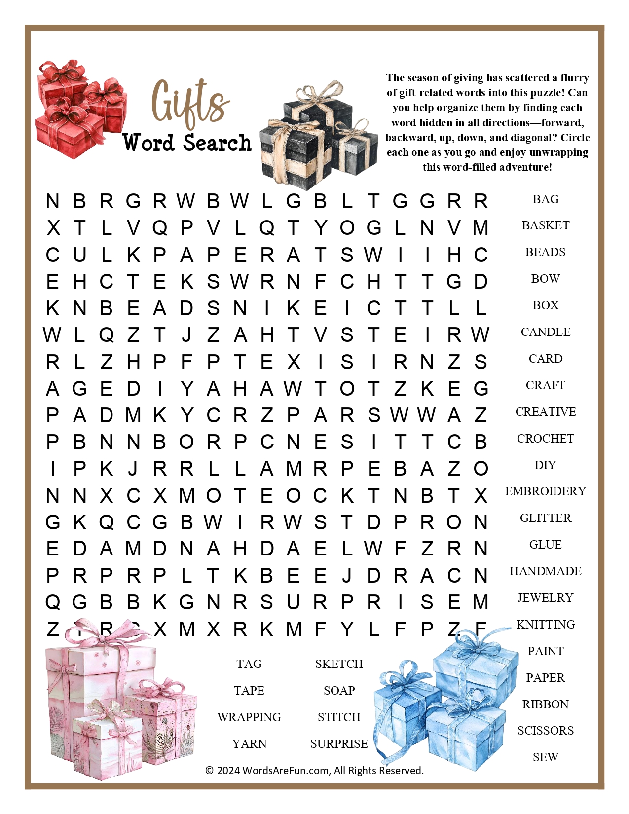 - 30 crafty gift-themed vocabulary words hidden in all directions