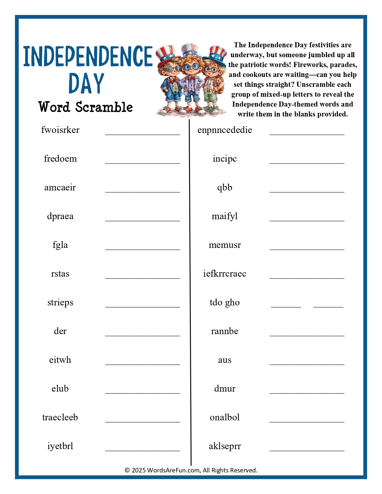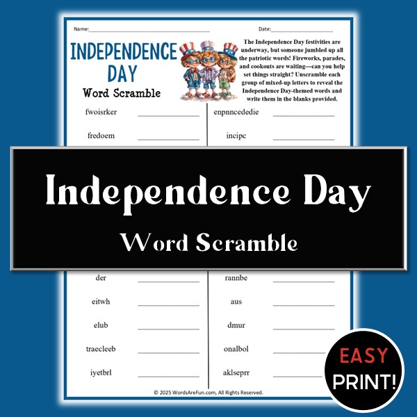 Bring the spirit of Independence Day into your learning or celebration with this easy-to-use, ready-to-print word scramble!