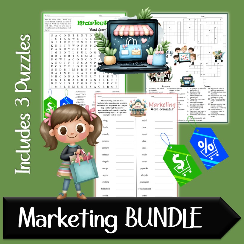 marketing activity pack, marketing crossword, marketing word search, marketing word scramble, marketing puzzle bundle, business activity printable, marketing printable pdf, branding activity for students, advertising worksheet, marketing vocabulary activity, marketing classroom activity, marketing homeschool printable, marketing fun activity, digital marketing puzzle, marketing training resource