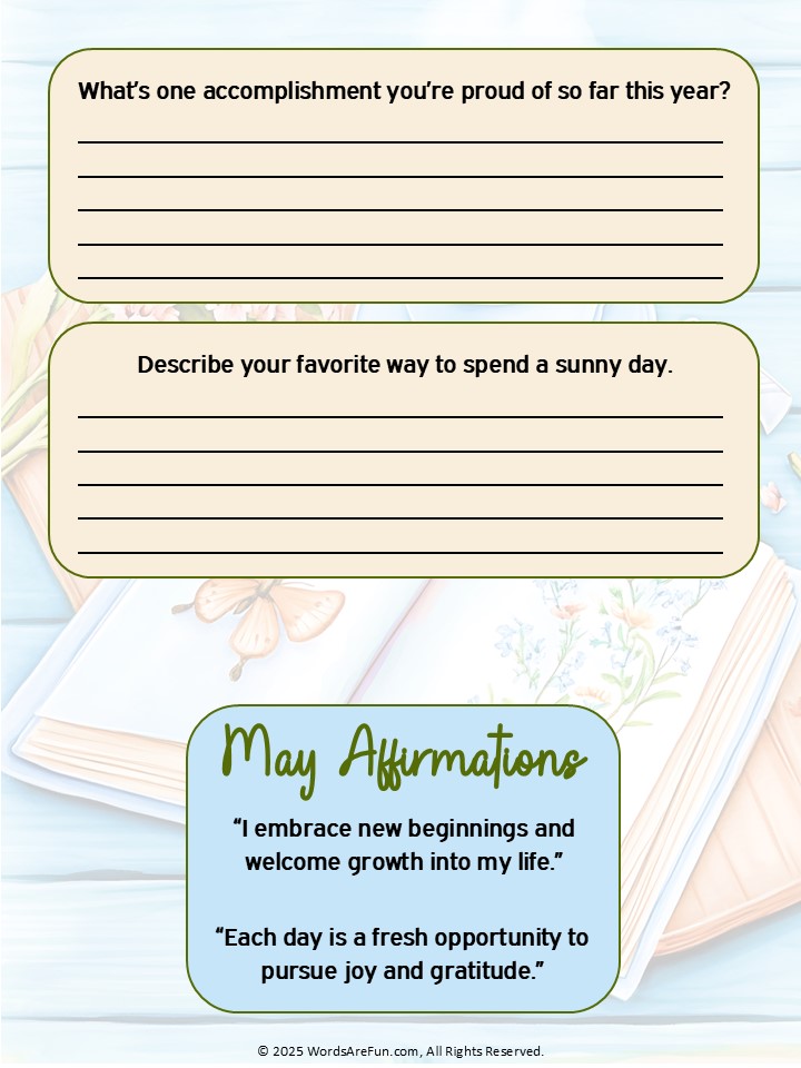 May journal prompts printable, May writing prompts PDF, printable May affirmations, May journal pages, May planner PDF, May calendar printable, May monthly reflection, May journal ideas, May self-care prompts, May homeschool writing activity, printable May worksheet, May goals planner, May mindfulness journal, May writing practice, printable May activities