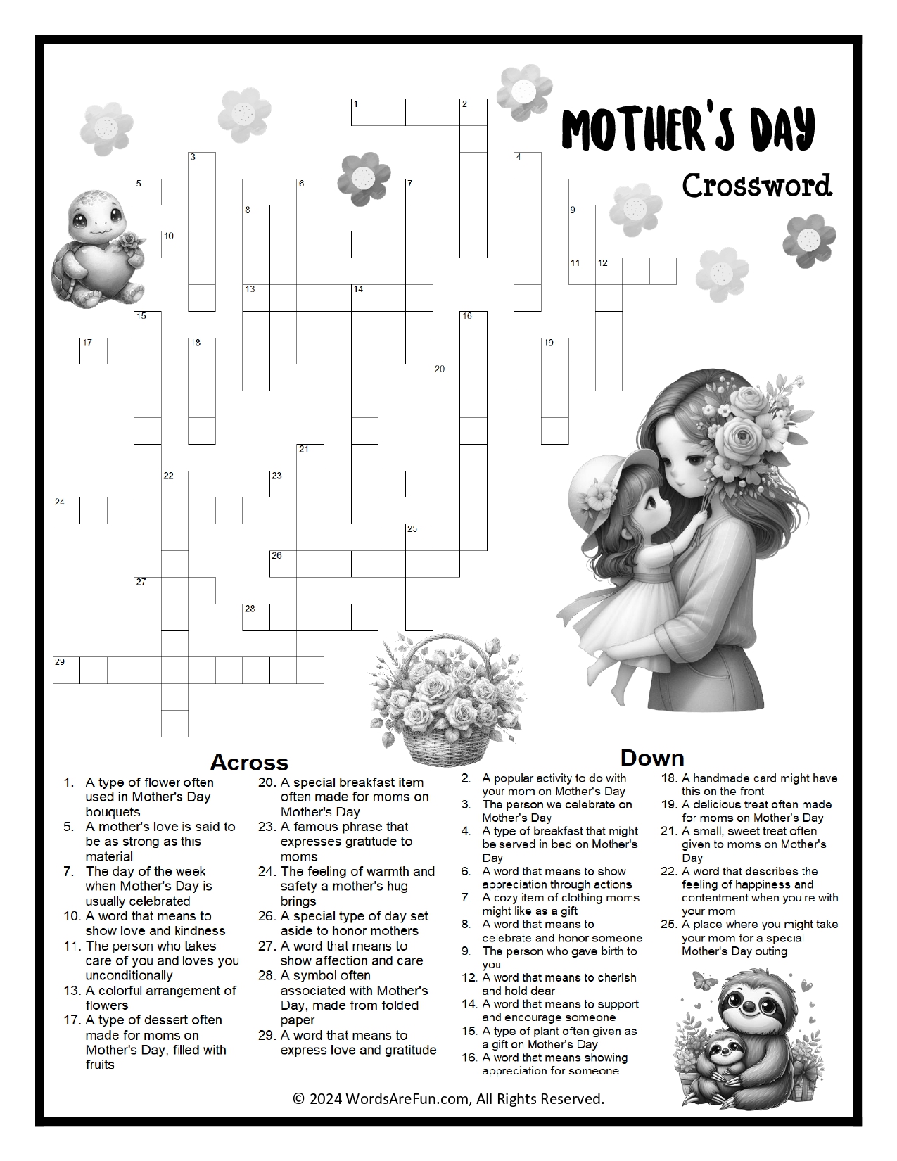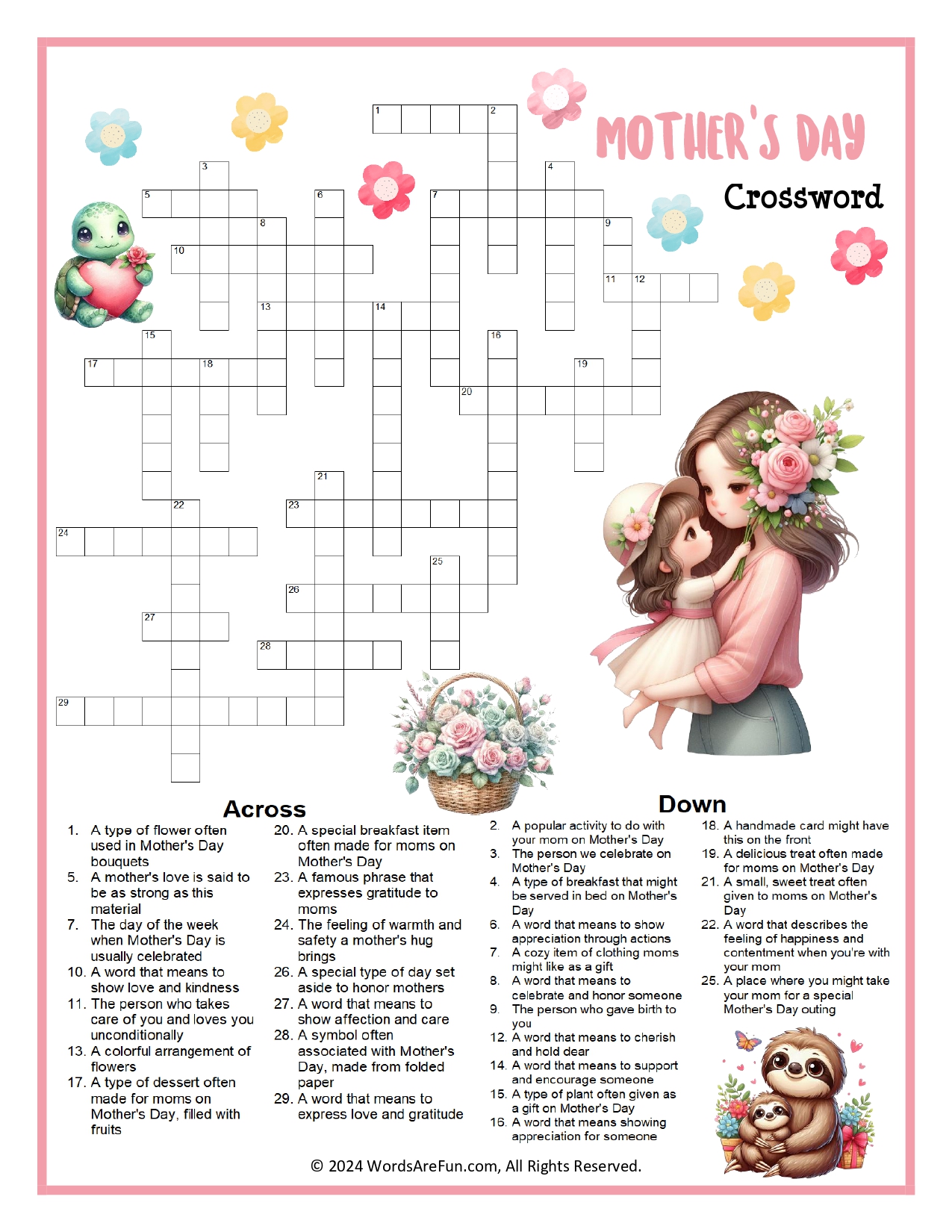 Mother’s Day Crossword Puzzle Printable PDF – Spring Holiday Word Search Activity with Answer Key – Classroom & Homeschool Worksheet