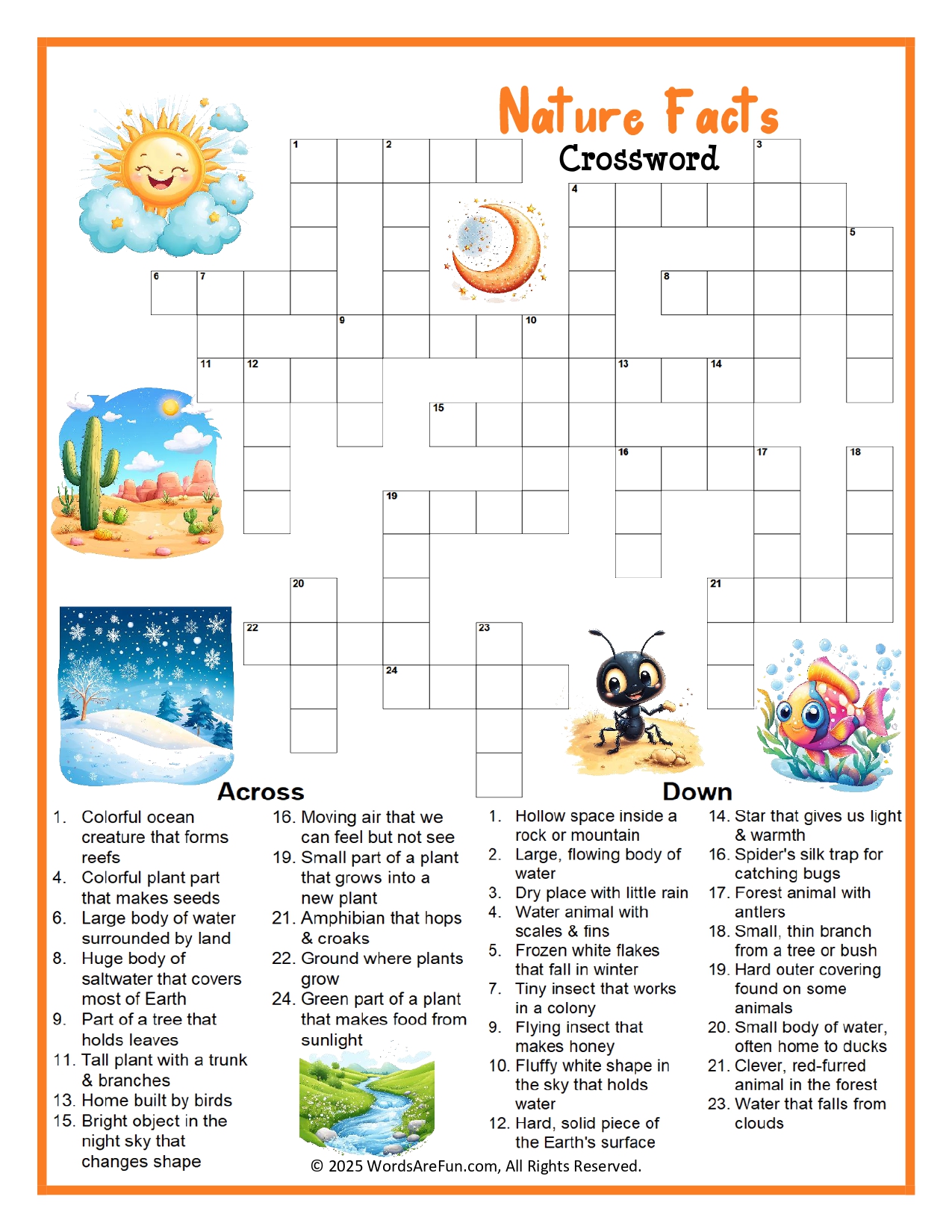 Make learning about nature fun with this Nature Facts Crossword Puzzle! Perfect for classrooms, homeschool, or brain-boosting fun at home, this printable crossword introduces kids to key nature terms like coral, river, forest, moon, sun, tree, and more.