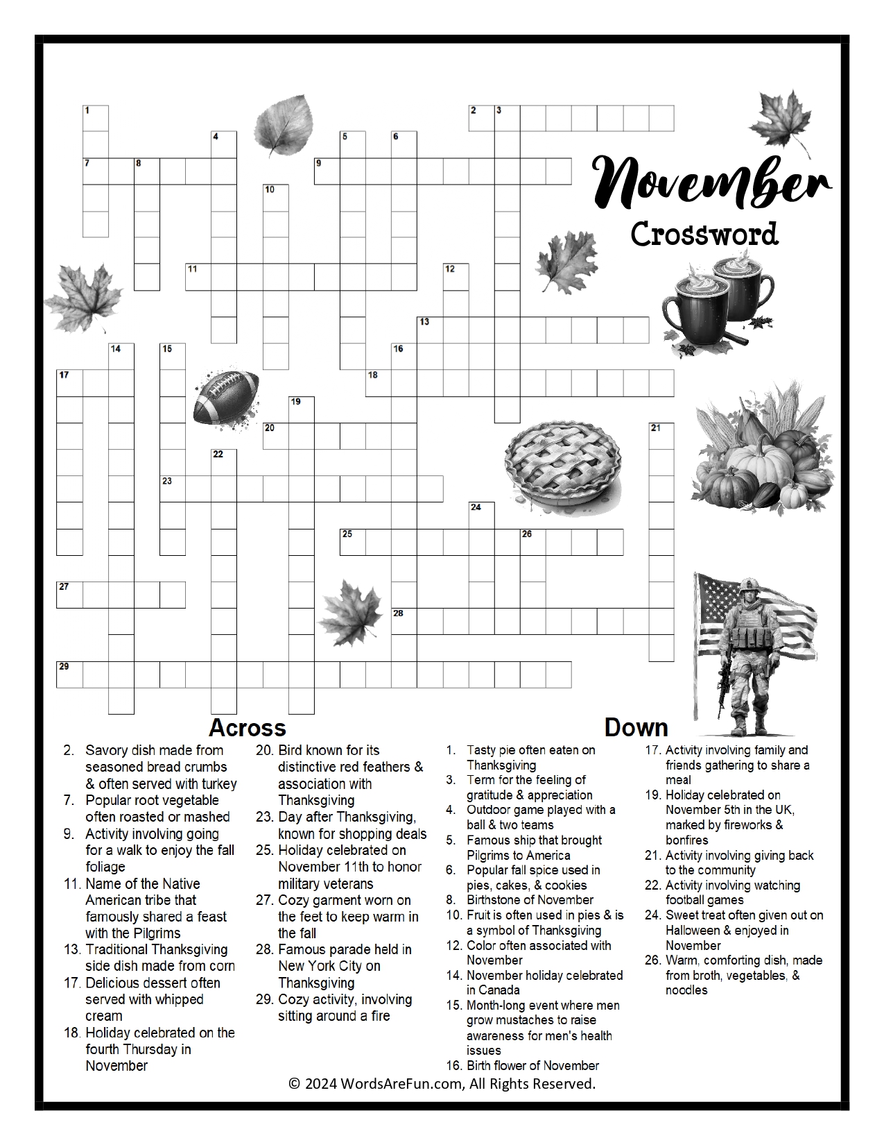 Embrace the cozy vibes of fall with this November-themed crossword puzzle, perfect for Thanksgiving, autumn activities, and seasonal fun. Whether you're enjoying a quiet afternoon or hosting a family game night, this puzzle brings the charm of fall traditions, seasonal foods, and festive holidays to life.