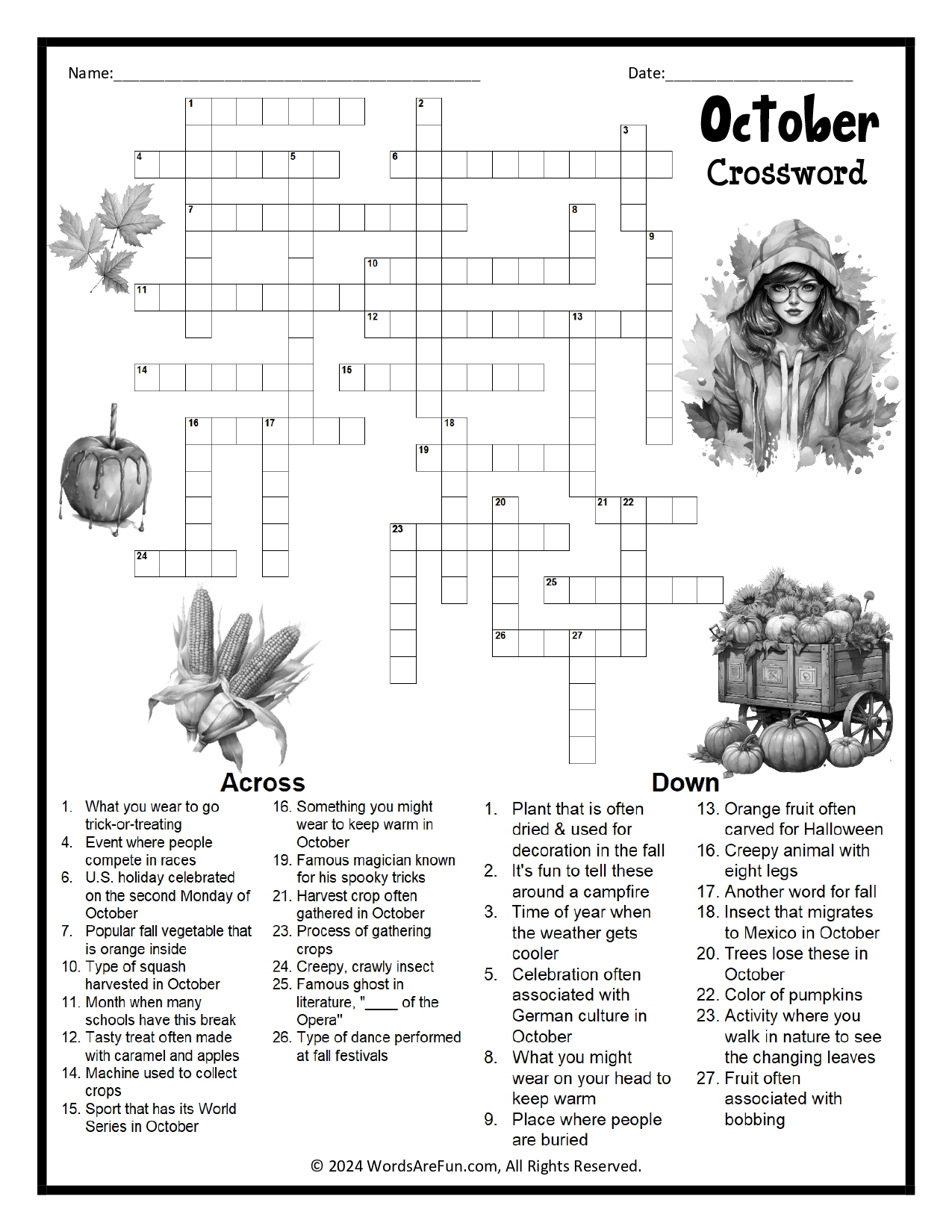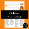 October crossword puzzle printable, Halloween crossword worksheet PDF, fall vocabulary activity, October classroom activity, printable crossword for kids, homeschool October activity, seasonal word puzzle PDF, autumn crossword worksheet, Halloween classroom activity, October learning game