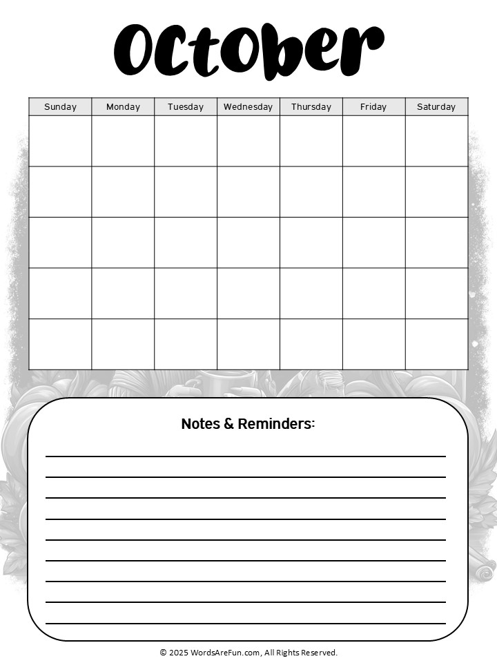 Encourage seasonal reflection and creativity with this October Journal Prompts Printable in a convenient, non-editable PDF format. It includes 5 themed journal prompts, 2 positive affirmations, 1 inspirational quote, and dedicated space for notes and reflections. You'll also get an undated monthly calendar and a notes and reminders section to support planning and mindfulness. Both color and black-and-white versions are provided, making it ideal for classrooms, teens, planners, and personal growth.