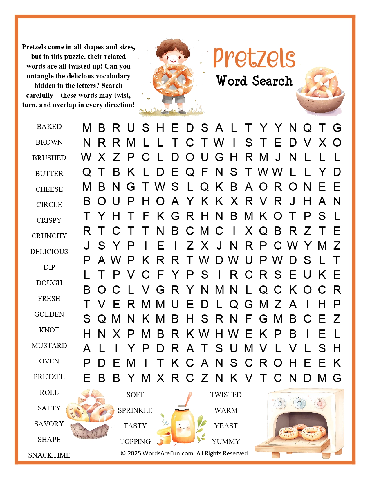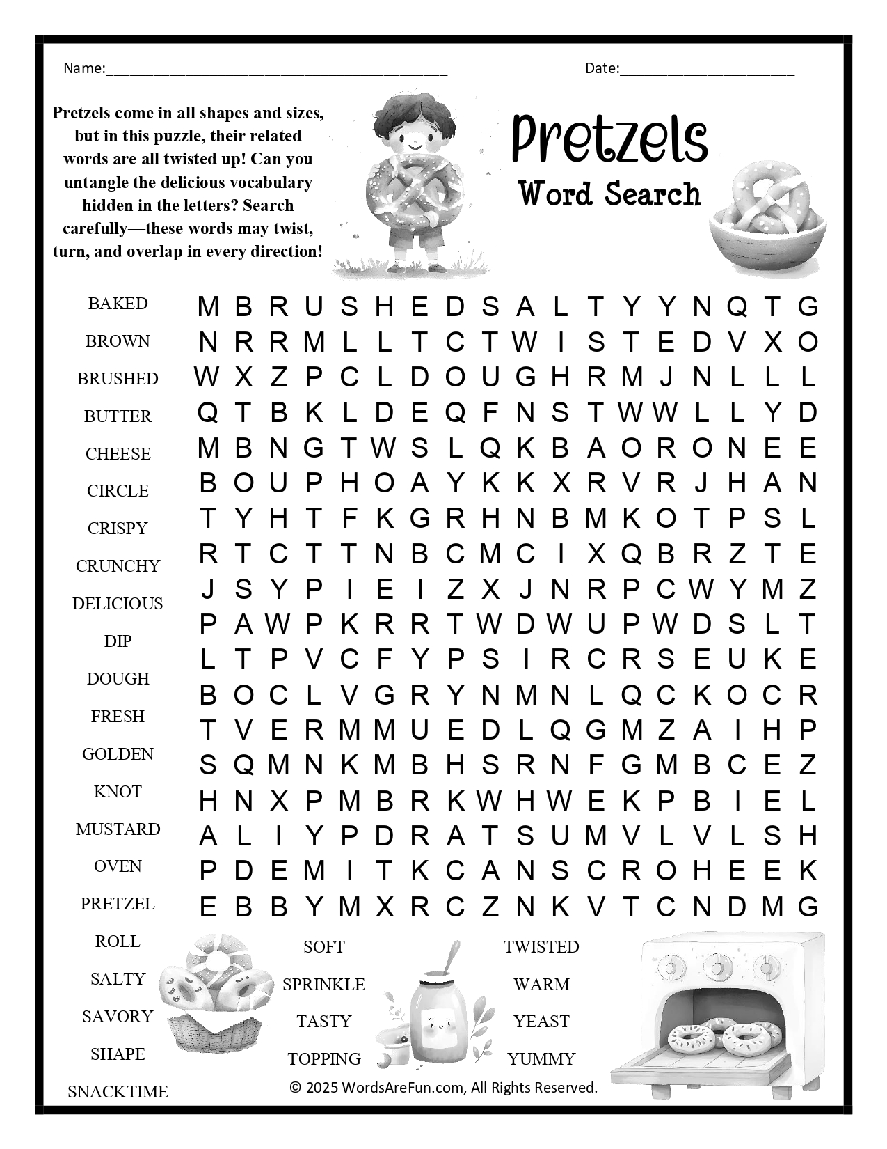 Word List: Baked, Brown, Brushed, Butter, Cheese, Circle, Crispy, Crunchy, Delicious, Dip, Dough, Fresh, Golden, Knot, Mustard, Oven, Pretzel, Roll, Salty, Savory, Shape, Snacktime, Soft, Sprinkle, Tasty, Topping, Twisted, Warm, Yeast, Yummy.