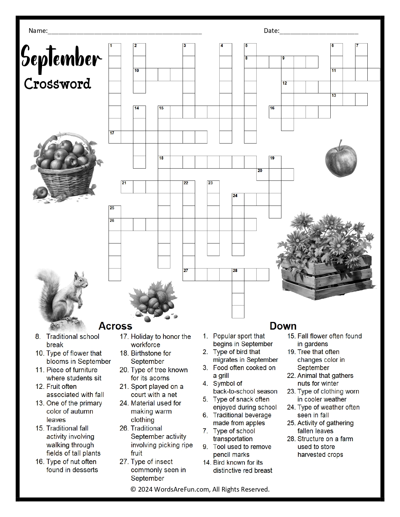 September crossword puzzle printable, fall activity worksheet PDF, back to school crossword, autumn themed classroom activity, September word puzzle, printable crossword for kids, September homeschool activity, fall vocabulary worksheet, fun classroom September activity, autumn learning game