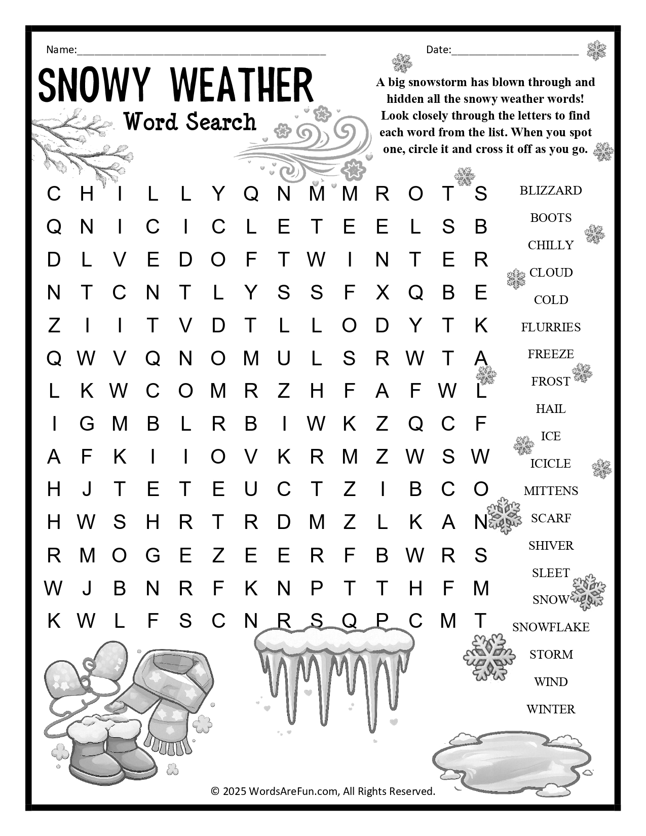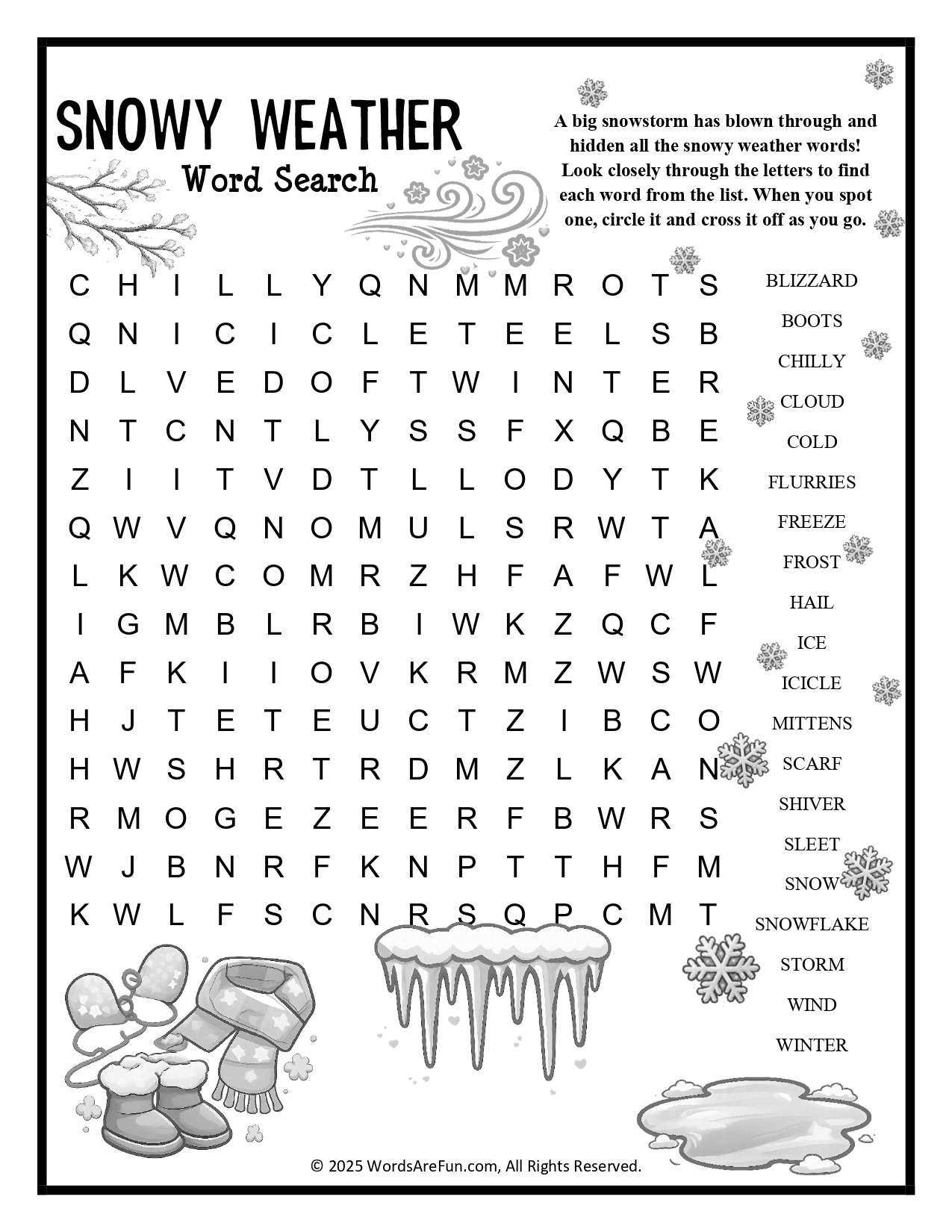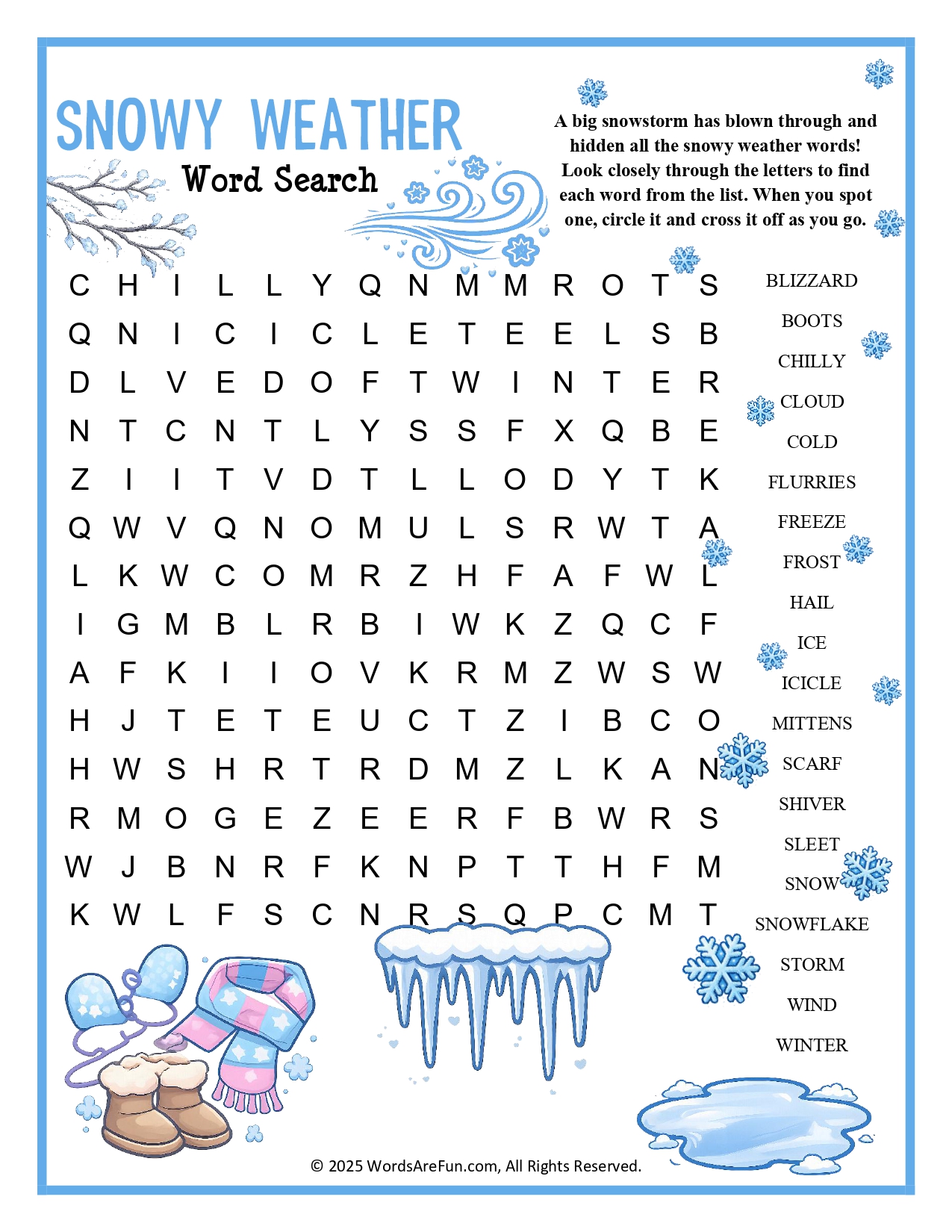 Word List: Blizzard, Boots, Chilly, Cloud, Cold, Flurries, Freeze, Frost, Hail, Ice, Icicle, Mittens, Scarf, Shiver, Sleet, Snow, Snowflake, Storm, Wind, Winter.