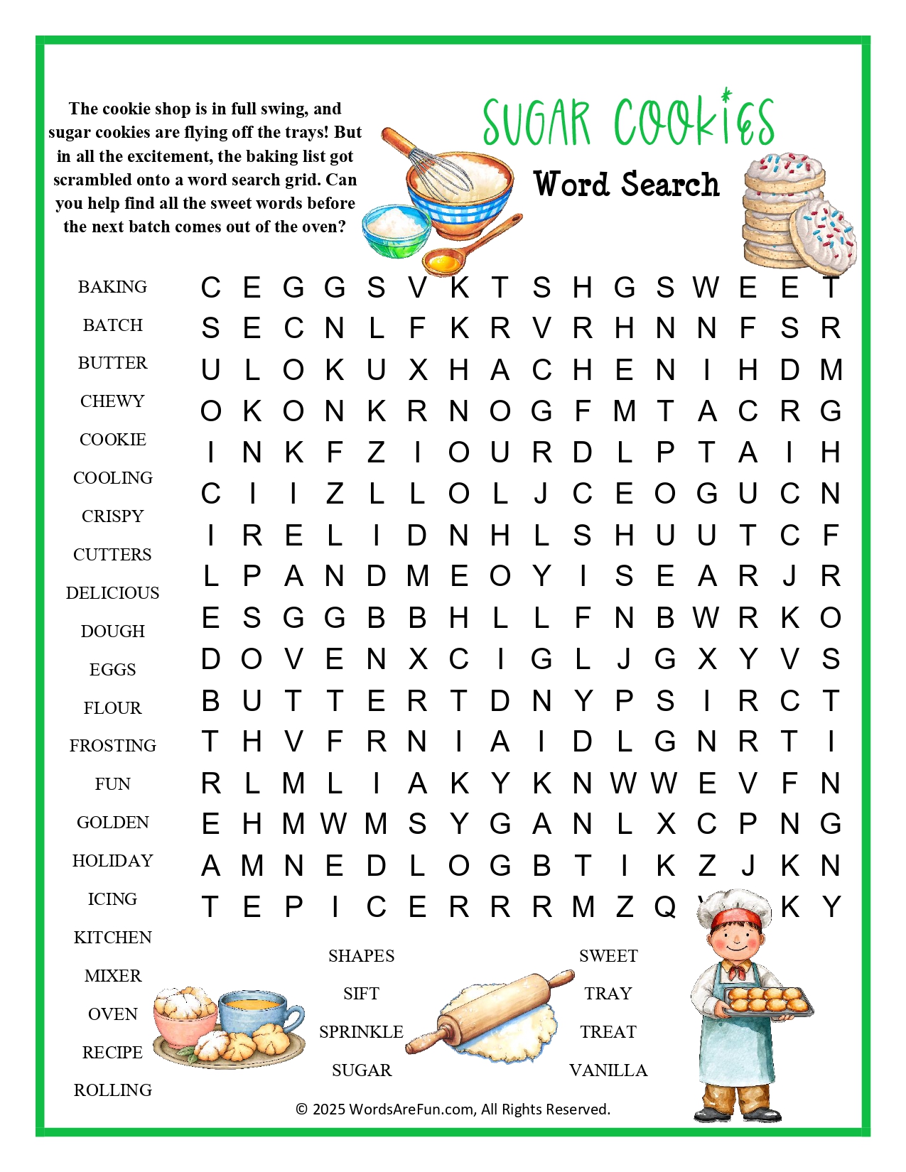 Word List: Baking, Batch, Butter, Chewy, Cookie, Cooling, Crispy, Cutters, Delicious, Dough, Eggs, Flour, Frosting, Fun, Golden, Holiday, Icing, Kitchen, Mixer, Oven, Recipe, Rolling, Shapes, Sift, Sprinkle, Sugar, Sweet, Tray, Treat, Vanilla.