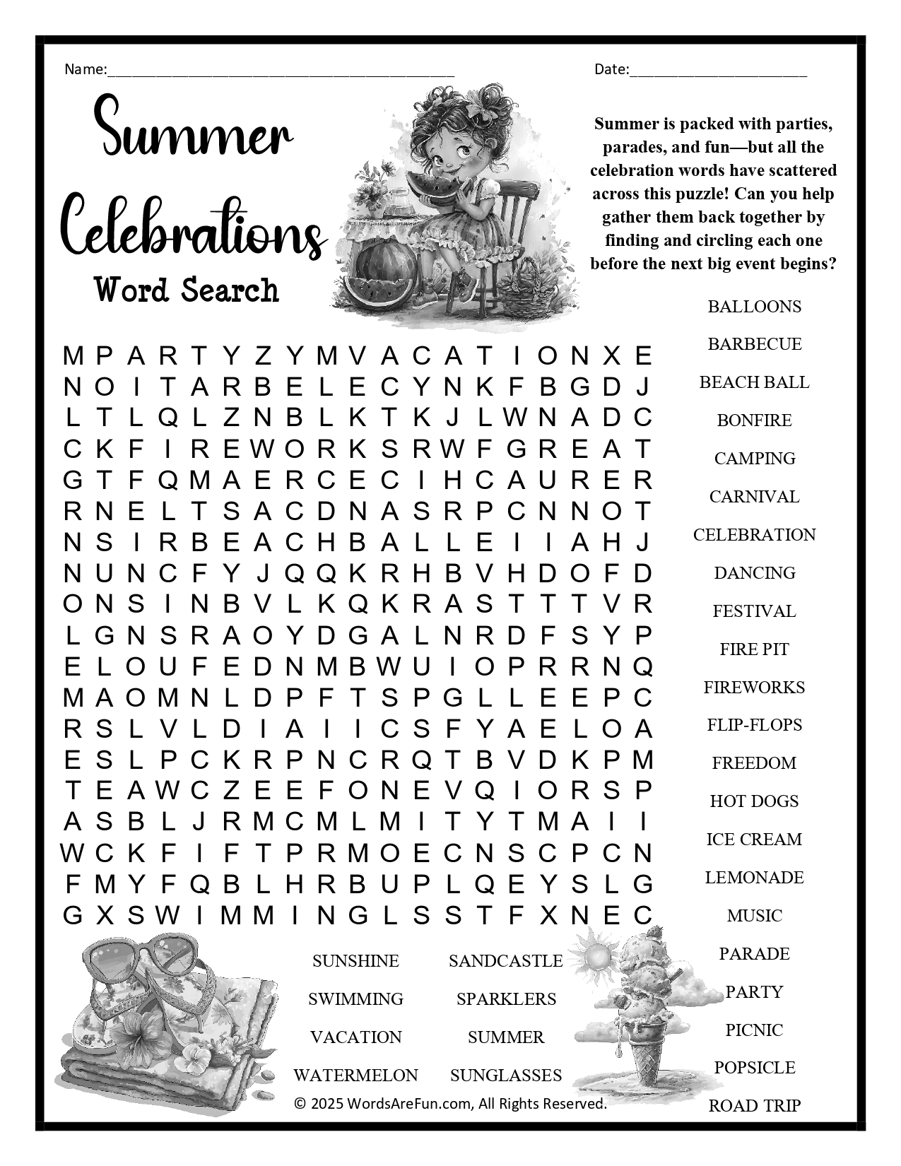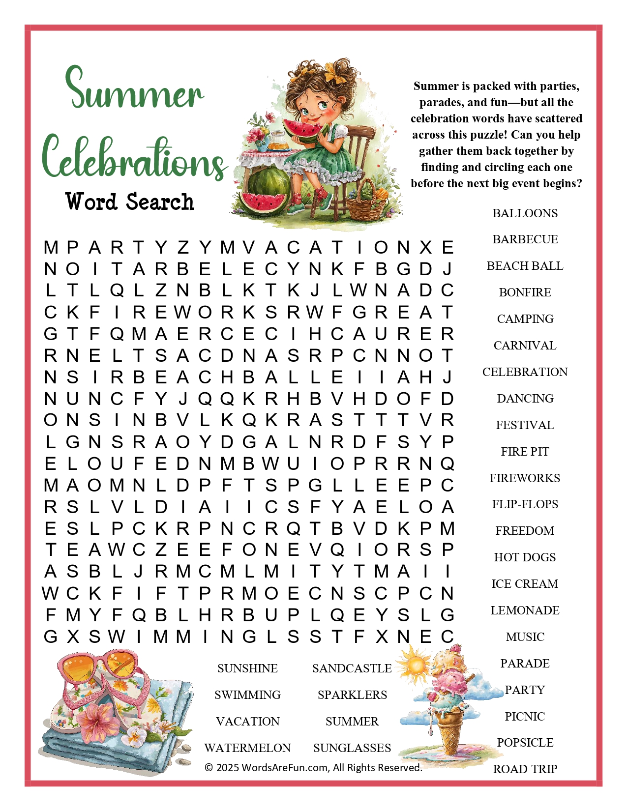 Word List: Balloons, Barbecue, Beach Ball, Bonfire, Camping, Carnival, Celebration, Dancing, Festival, Fire Pit, Fireworks, Flip-Flops, Freedom, Hot Dogs, Ice Cream, Lemonade, Music, Parade, Party, Picnic, Popsicle, Road Trip, Sandcastle, Sparklers, Summer, Sunglasses, Sunshine, Swimming, Vacation, Watermelon.
