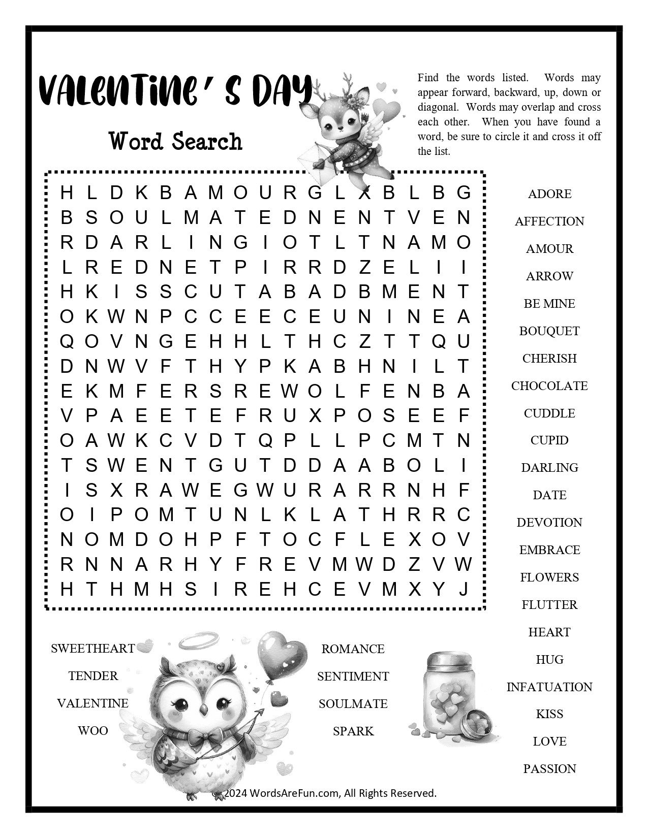 Word List: Adore, Affection, Amour, Arrow, Be Mine, Bouquet, Cherish, Chocolate, Cuddle, Cupid, Darling, Date, Devotion, Embrace, Flowers, Flutter, Heart, Hug, Infatuation, Kiss, Love, Passion, Romance, Sentiment, Soulmate, Spark, Sweetheart, Tender, Valentine, Woo.