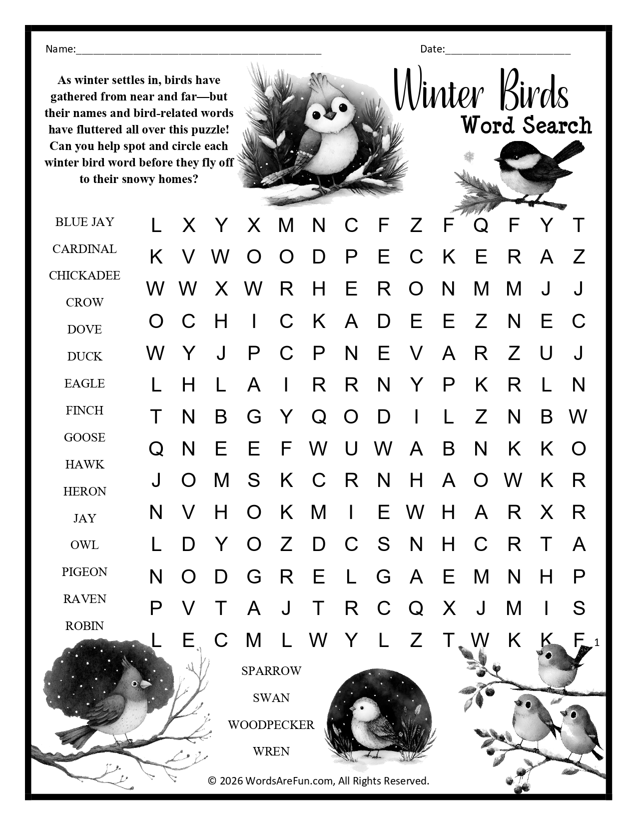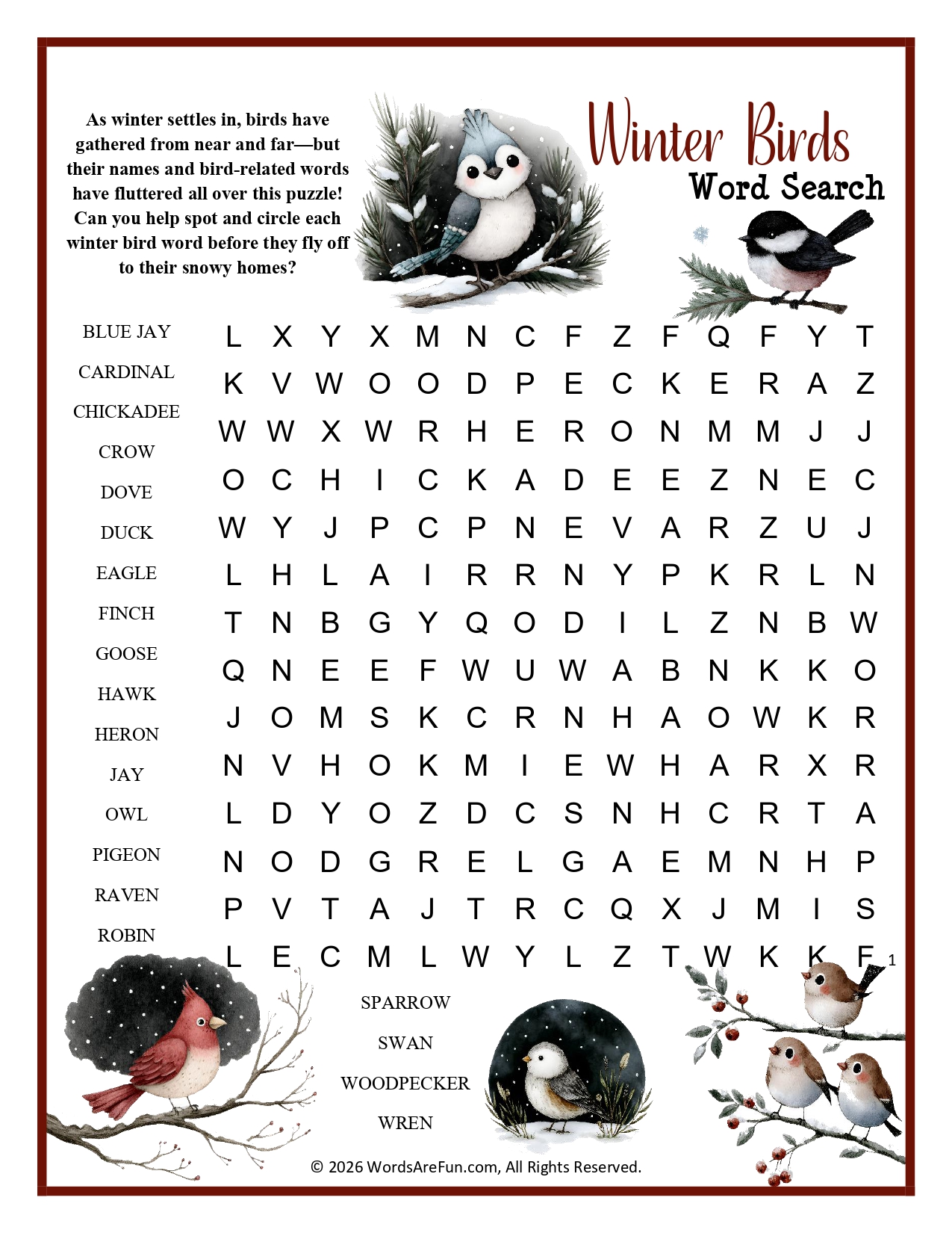 Winter Birds Word Search Printable PDF – Birdwatching & Nature Study Activity for Kids with Answer Key
